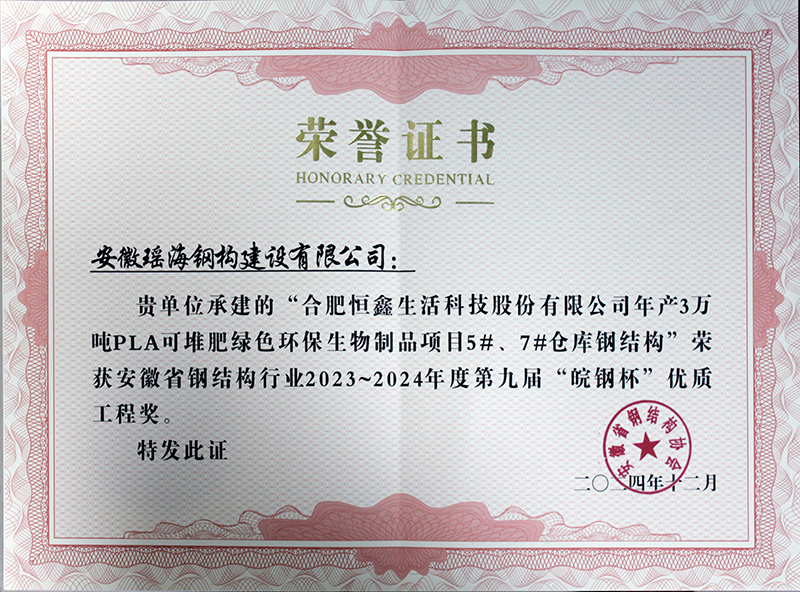恒鑫項目獲皖鋼杯優質結構獎