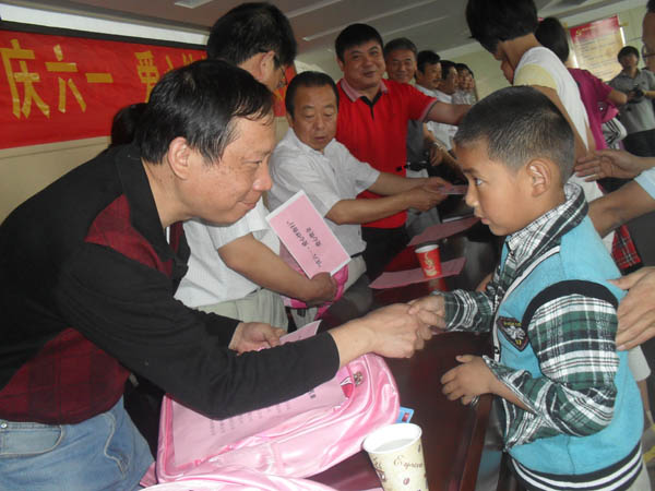 .圖為工程副總夏源代表公司將愛(ài)心款及學(xué)習(xí)用品送給受資助的兒童.