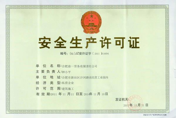 資質辦為集團公司下屬子公司(合肥鼎一勞務有限責任公司)繼資質申報成功后再次成功申報到該子公司的安全生產許可證。屆時,集團公司再增建筑行業勞務分包領域資格。