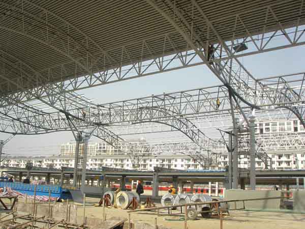 4、京滬高速鐵路Ⅳ標段蚌埠南站站臺雨棚鋼結構工程:京滬高速鐵路蚌埠南站站房由桁架、鋼管柱、檁條、系桿、支撐組成,桁架采用三角形鋼管結構體系,鋼管之間采用直接相貫的焊接節點。邊跨柱為雙鋼管格構柱。桁架最大跨度為33米,縱向為159米。有組織排水,設計使用年限為50年,建筑結構安全等級為二級,七度設防,抗震設防類別為標準設防。蚌埠南雨棚總長421米,寬121.15米,沿雨棚縱向共有26條軸線,橫向有4條軸線,鋼結構覆蓋面積51176.5㎡,雨棚全長范圍 內設置2道伸縮縫,位于P7、P19軸。雨棚為鋼管桁架體系,桁架上弦中心線高度16.7米。平行于股道方向柱距為18米,天橋處為21米,垂直股道方向柱跨分別為41.65米,33.50米和43.00米。