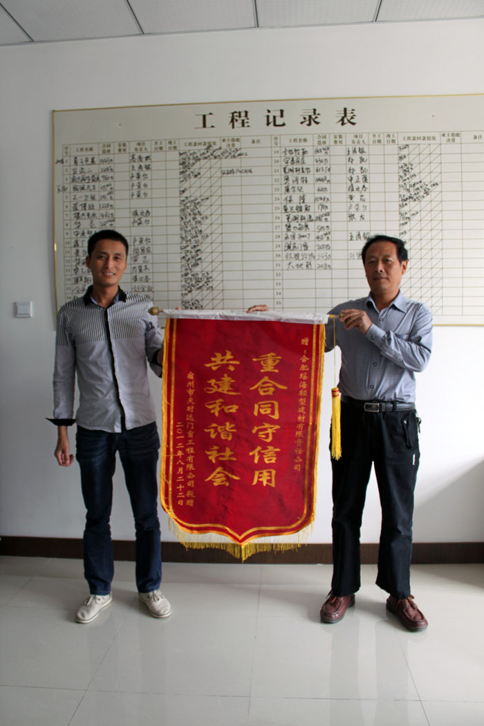 本報訊:2012年10月8日,時值雙節過后,宿州天時達門窗有限公司負責人給瑤海鋼構送來一面錦旗,感謝瑤海鋼構的“重合同、守信用”。據了解,天時達公司是瑤海鋼構在滁州東菱電器6#廠房建設中的合作伙伴,在合作的過程中,瑤海鋼構嚴格按照事先約定的合同如期履行,最終,工程質量得到了保證,天時達獲得了效益。為此天時達特送錦旗一面,以表感謝。其實自瑤海鋼構接到第一筆工程以來,公司就嚴格按照合同履行,履行合同的內容,遇到合同未涉及到的內容都能夠積極主動找到對方進行協商解決。多年了,瑤海鋼構經過努力,現已全面通過質量管理體系、環境管理體系、職業健康安全管理體系、測量管理體系、標準化良好行為規范等五大體系認證,并在實踐中得到了充分、有效和適宜地運行,同時,在生產過程中嚴格執行合同的相關行業標準,確保產品質量達到一流水平。