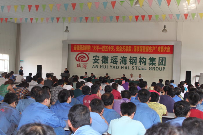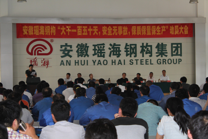 2013年6月3日下午兩點,安徽瑤海鋼構集團公司在公司多功能廳隆重舉行了“大干150天,安全無事故,保質保量保生產”勞動競賽動員大會并取得圓滿成功。