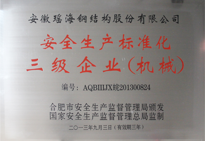 近日,經(jīng)國家安全生產(chǎn)監(jiān)督管理總局監(jiān)制,合肥市安全生產(chǎn)監(jiān)督管理局審核頒布,安徽瑤海鋼結(jié)構(gòu)股份有限公司榮獲安全生產(chǎn)標準化三級企業(yè)(機械)證書。沉甸甸的獎牌不僅僅只是榮譽,更是對瑤海鋼構(gòu)多年來安全管理工作的肯定。