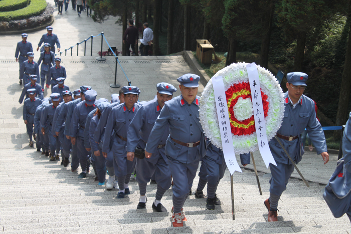 接下來,我們來到烈士陵園祭英雄——井岡山革命烈士陵園,這里是一座山,郁郁蔥蔥。陵園以階梯修筑,走進園門,便是109級臺階,高聳而凝重,我們急促的心情隨之放慢。來到革命烈士靈堂,我們懷著一顆虔誠的心,獻上了花圈并深深地鞠了躬,同時默哀3分鐘,緬懷那些在井岡山斗爭中犧牲的革命先烈和那些未能留下名字便匆匆離開這個世界的無名英雄,緬懷他們在艱難困苦的革命年代,為了締造“共和國第一塊奠基石”而獻身的精神。英烈堂前上書的“井岡山根據地革命先烈永垂不朽”十四個醒目的大字,更讓人頓生浩然正氣凜然涌動、陽剛之力震懾靈肉之感。置身其中,一種心眼濕潤的感覺油然在心底升起。井岡山的松柏為什么四季常青?一定是先烈的身軀所化成!井岡山的杜鵑花為什么這樣紅,一定是先烈的鮮血所染紅!黨魂浩然,英魂長存,死難烈士猶如火中的鳳凰,得到永生。