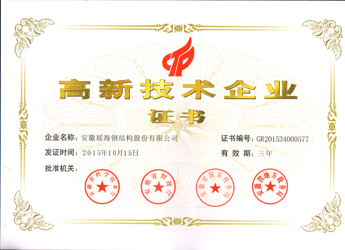 高新技術企業屬于國家重點支持的具有高成長性的創新型企業,具有較好的潛在經濟價值, 獲得該項認定有利于進一步提升企業自主創新能力、加強企業的核心市場競爭力、 然認證要求嚴格,包含一系列條件、指標和復雜的流程,企業需要經過多年良好經營才有望達到標準,安徽瑤海鋼結構股份有限公司沖破重重困難,歷經幾番周折,終于在 2008 年第一次通過國家高新技術企業認定,期間又經歷了 2011 年的高新技術企業復審,總歷6 年。