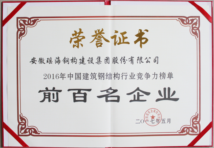 本報訊:近日,安徽瑤海鋼構建設集團從中國建筑金屬協(xié)會上頒回“中國鋼結構行業(yè)競爭力榜單前100強企業(yè)”榮譽獎牌。