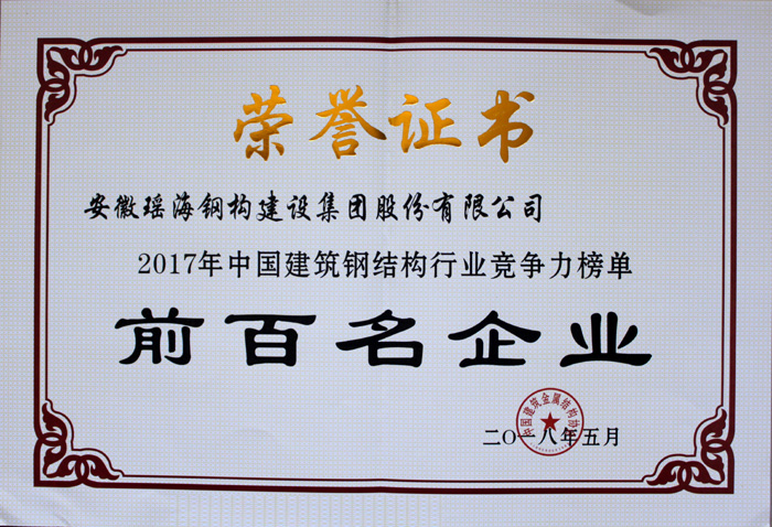 本報訊:近日,安徽瑤海鋼構建設集團從中國建筑金屬協會上頒回“中國鋼結構行業競爭力榜單前100強企業”榮譽獎牌。