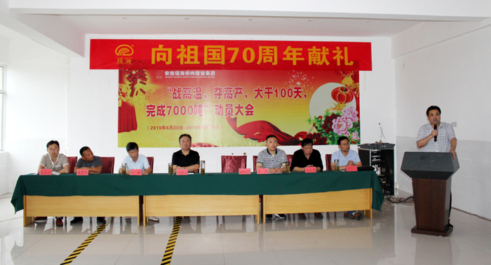本報訊:為貫徹“6.6”會議精神,按照6月9日總經理辦公會議要求,2019年6月20日,安徽瑤海鋼構建設集團“戰高溫、奪高產,大干100天,完成7000噸”動員大會在新橋事業部隆重召開,集團公司主要領導參加了會議,董事長凌紅兵應邀參加了會議。會議由工會主席王一麟主持。