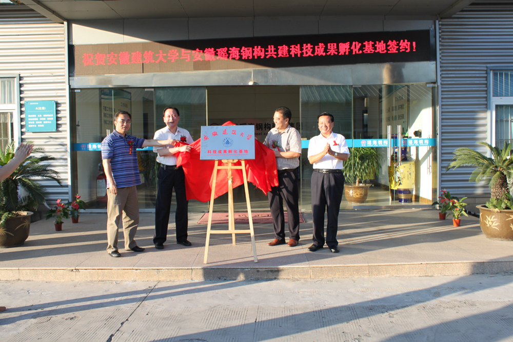 最后,在日月同輝的見證下,在各位代表的熱烈掌聲中,安徽建筑大學副校長蔡新立,安徽瑤海鋼構董事長凌紅兵、新站區管委會副主任藍天,合肥市原政協主席周富如共同揭開了安徽建筑大學科技成果孵化基地的銅牌。以此正式確定合作意向。