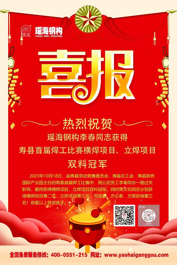 本次大賽中,瑤海鋼構選送的李春選手從比賽中脫穎而出,獲得兩個項目雙料冠軍!“我們永遠追求卓越,信譽始終如一”是瑤海鋼構一直堅持的企業理念,也是對企業質量文化的深刻詮釋。瑤海鋼構二十余載的精誠筑夢,是對產品品質的不懈追求。堅持精工制造、創新發展,客戶的成功才是我們的成功,瑤海鋼構一直在路上。