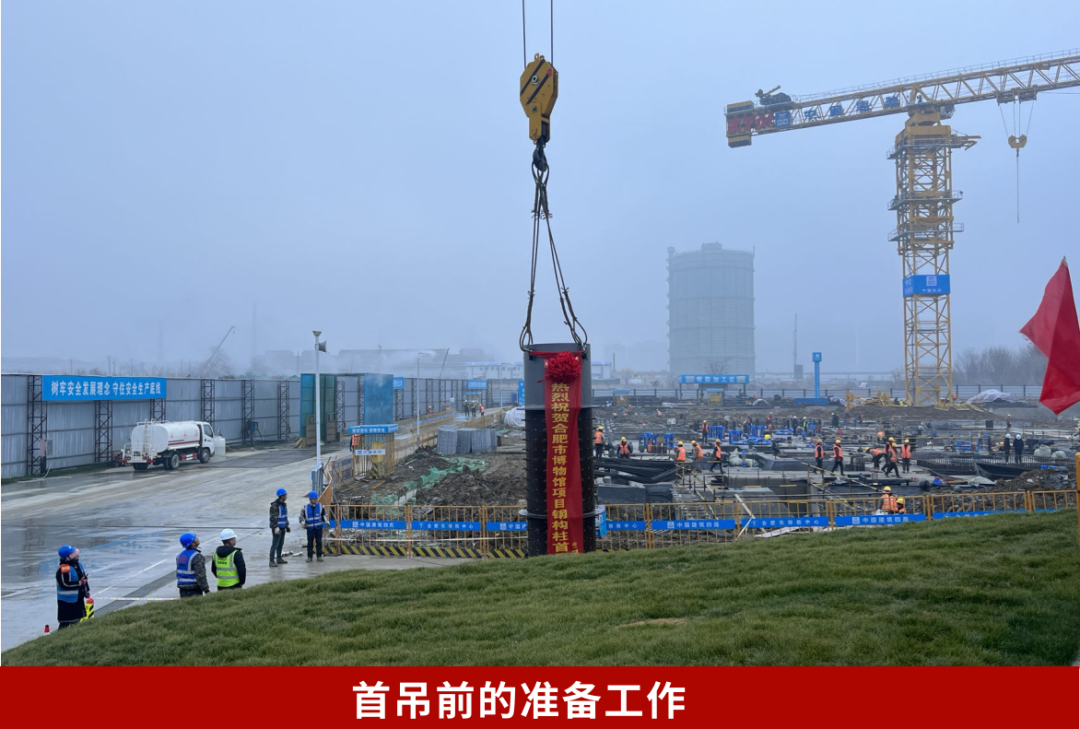 上午9點16分,隨著東管辦建設處王處長和瑤海鋼構凌董起吊指令的下達,一根高約4.78米,重約11噸的鋼柱被緩緩吊起,對準位于9區 軸6交軸D(地下室負二節柱)基坑安裝位置緩慢落下。精準掛鉤、慢起吊、輕落位,合肥市博物館項目鋼結構首吊順利完成安裝,標志著項目全面進入項目主體鋼結構施工階段!