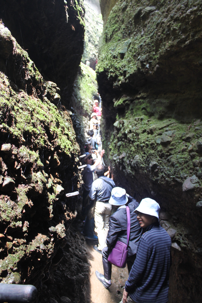 裂谷內(nèi)壁嶙峋怪石千姿百態(tài),裂谷腳下泉水歡快流淌,時而一片秀竹如海,時而一排幽深崖洞。行走在峭壁上的嬌小的導(dǎo)游,似乎是女俠般輕松,在我們氣喘吁吁之際,為我們講解著沿途的神蛙石、一線天、點將臺、石窟王宮(避王巖)、清水潭、蘑菇石、三道閘、回音壁、藏寶閣、窺天崖等景點。
