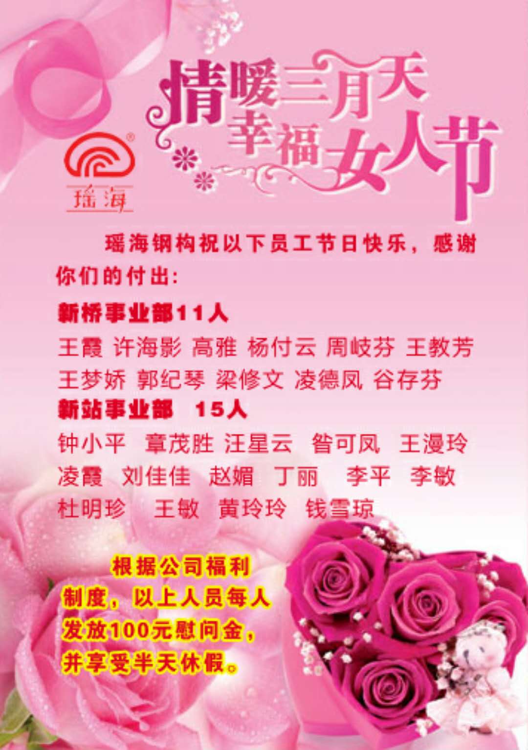 日,國際女人節,為了更好地體現對女同胞的關愛,安徽瑤海鋼構在國際婦女節當天發放慰問金,并全體女同胞放假半天,以示慶祝。
