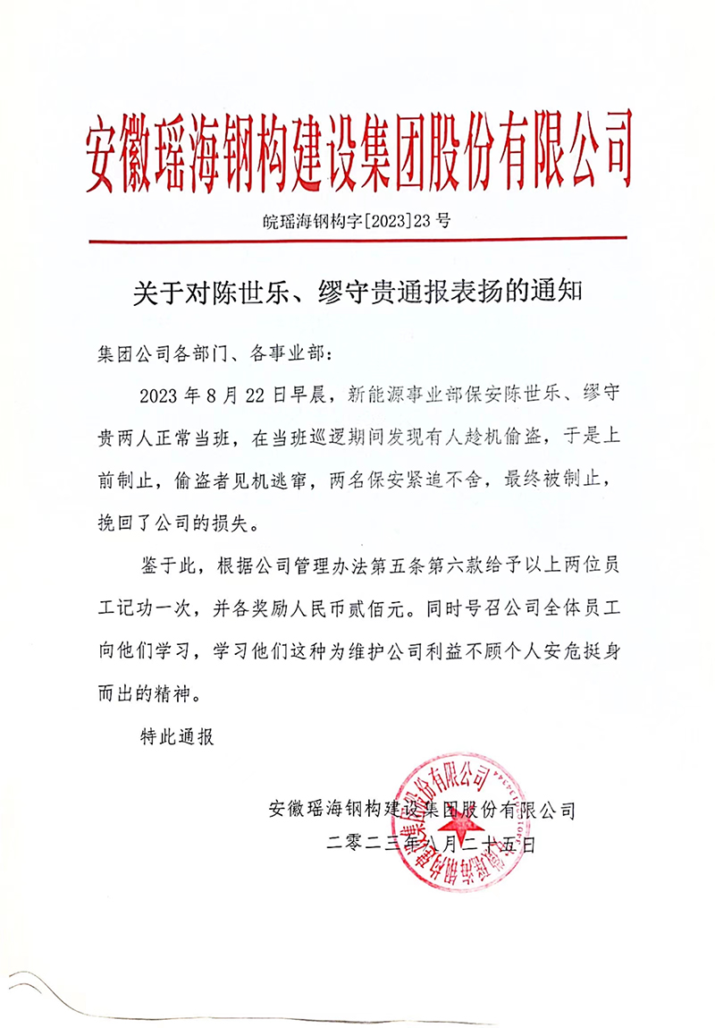 2023年8月22日早晨,新能源事業(yè)部保安陳世樂、繆守貴兩人正常當(dāng)班,在當(dāng)班巡邏期間發(fā)現(xiàn)有人趁機(jī)偷盜,于是上前制止,偷盜者見機(jī)逃竄,兩名保安緊追不舍,最終被制止,挽回了公司的損失。